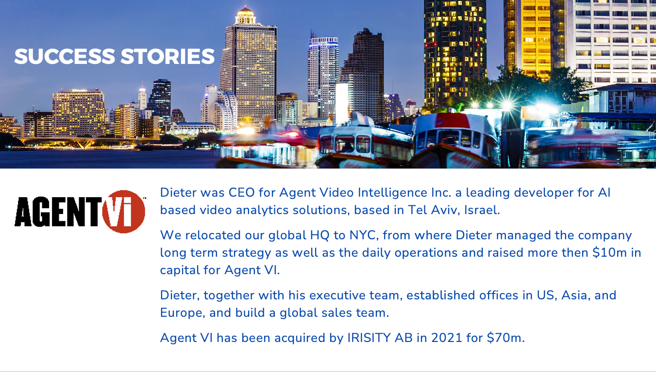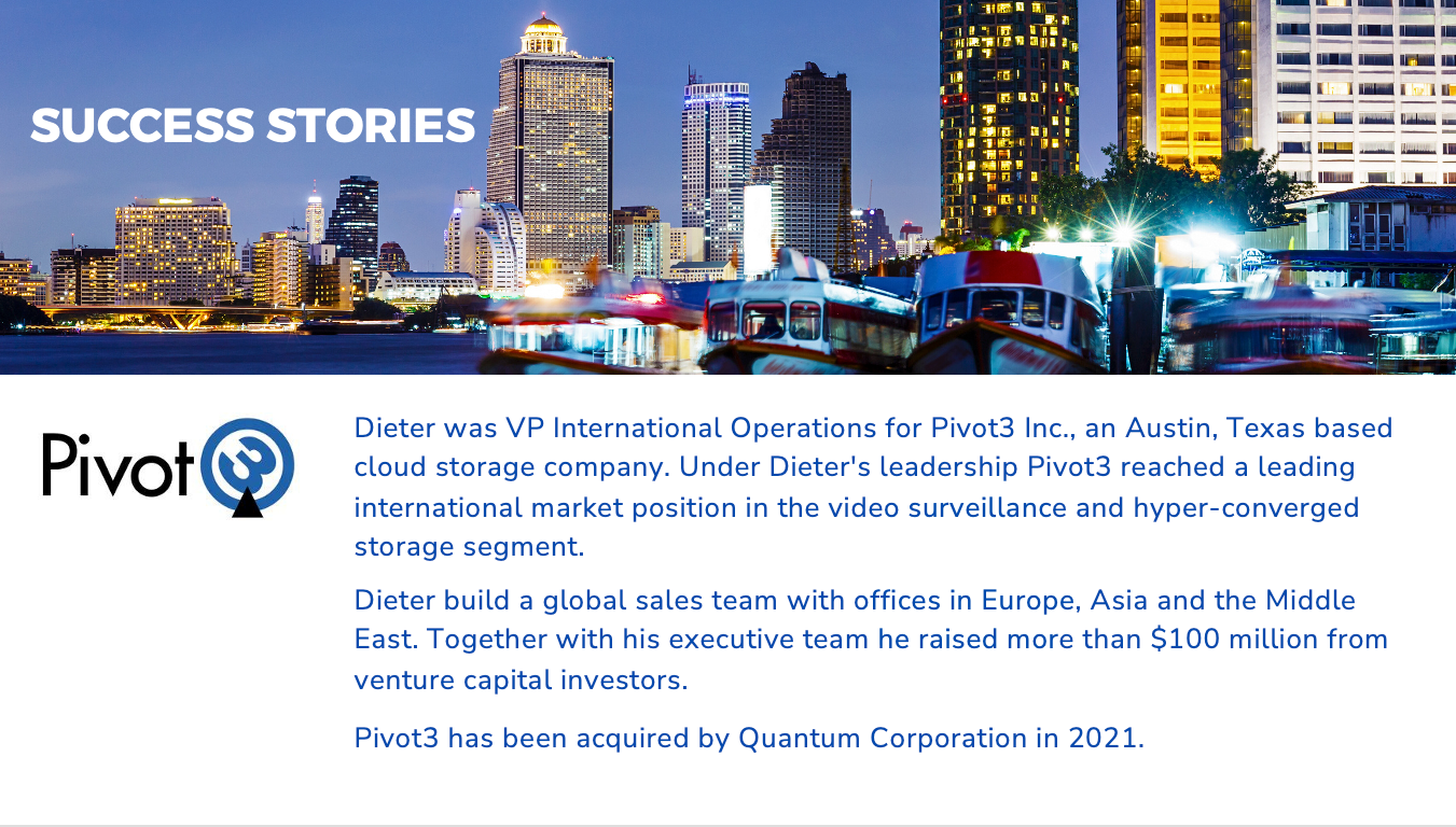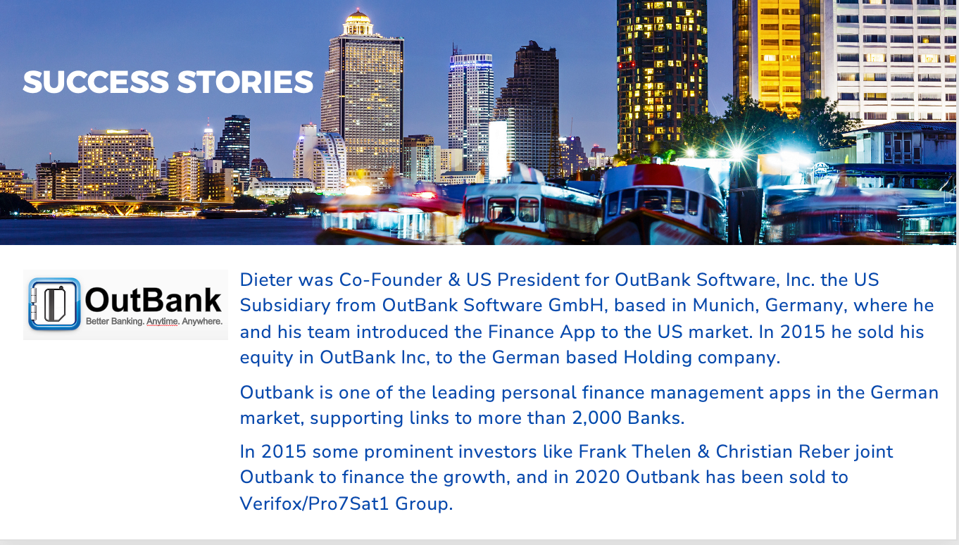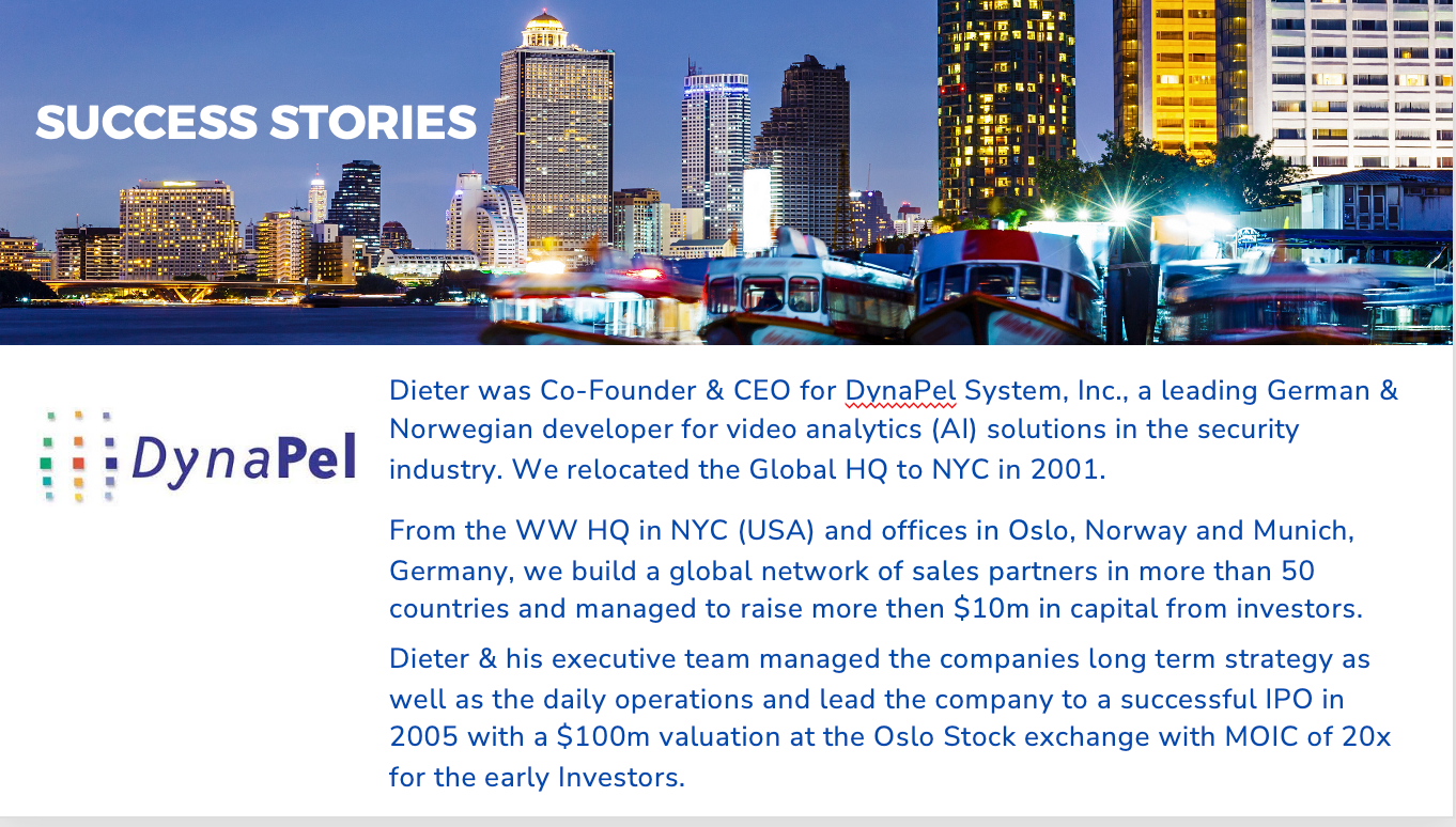 As Co-Founder and C-Level Executive with European & US technology companies, our Founder Dieter Kondek managed successfully several capital raising rounds and US market entry & expansion projects from 2000 - 2024. He was involved with 3 successful exits, one with an IPO